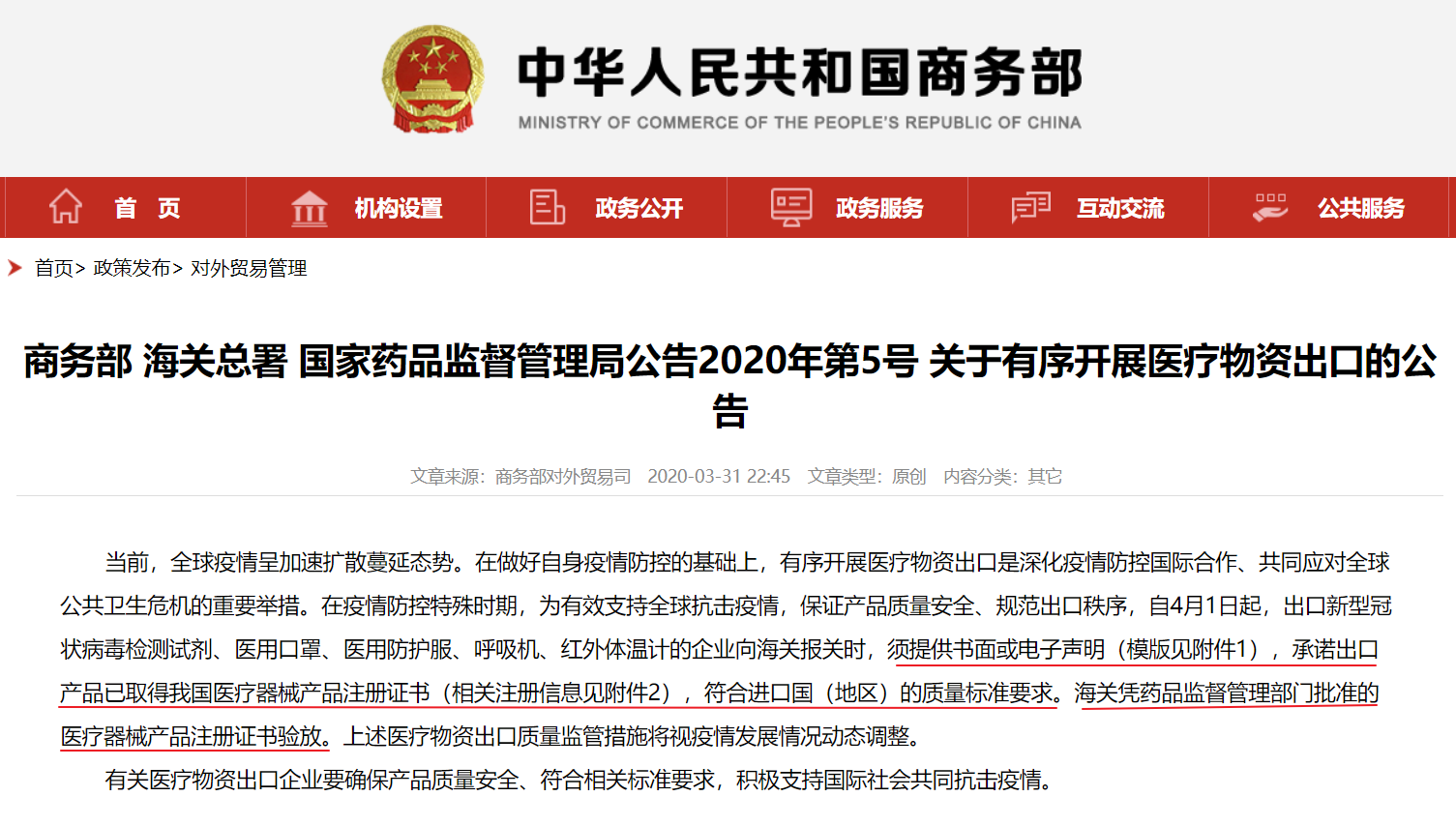 商务部 海关总署 国家药品监督管理局公告2020年第5号 关于有序开展医疗物资出口的公告
